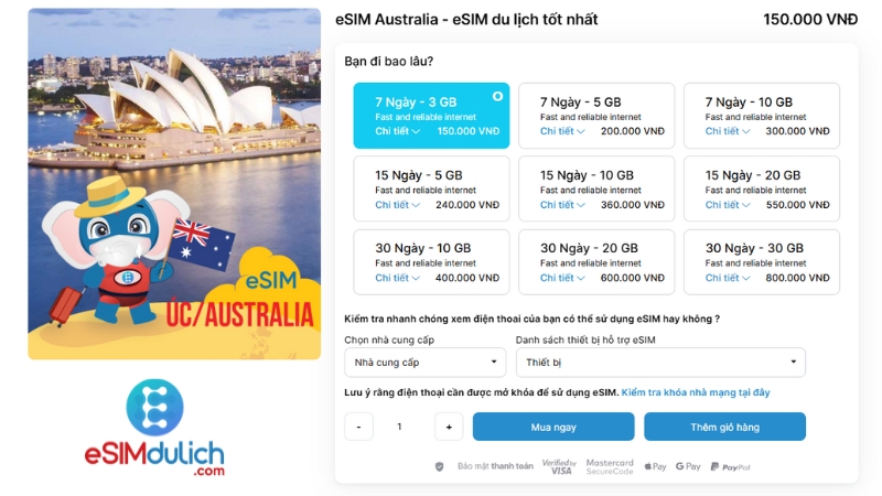 eSIM du lịch Úc dung lượng 3–30GB, cho chuyến đi từ 5–30 ngày, phủ sóng 4G/5G toàn quốc. Mua dễ dàng tại esimdulich.com